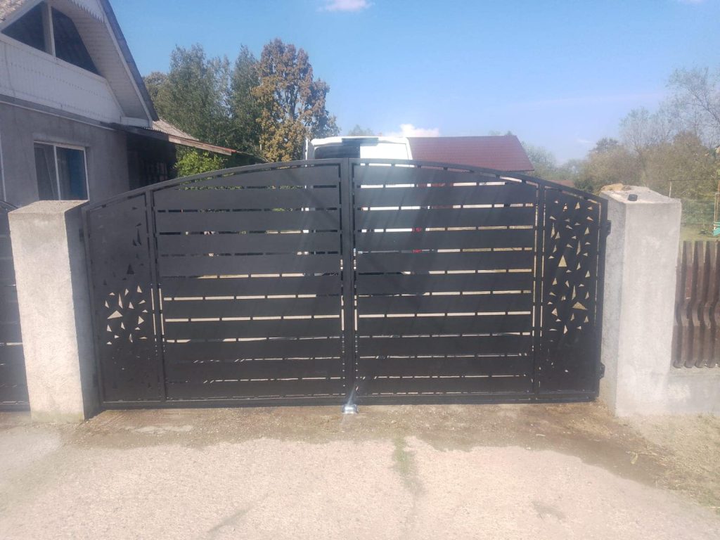 - Porți decorative: Realizate din fier forjat sau oțel cu ornamente, aceste porți sunt preferate pentru estetica lor unică și sunt ideale pentru case sau spații comerciale cu un design elegant.